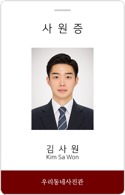 우리동네사진관에서는 증명사진, 신분증사진, 취업사진, 승무원사진 및 여권, 비자사진 등 다양한 사이즈와 규정에 맞춘 사진 촬영이 가능합니다.